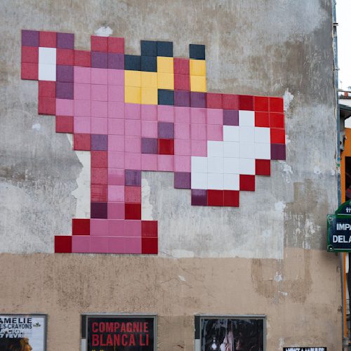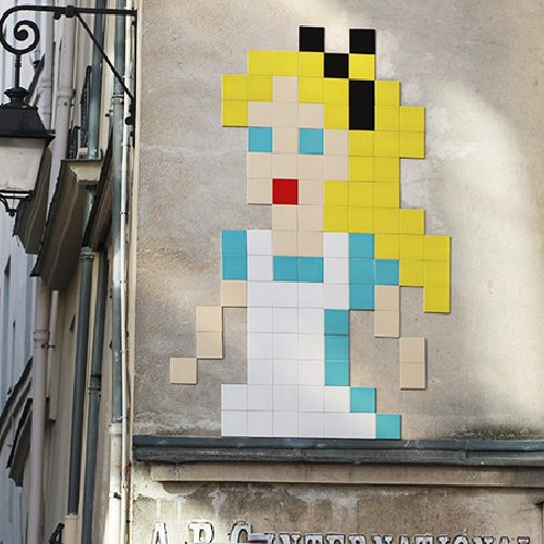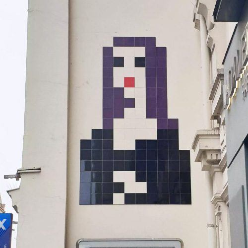 Invader a également fait des mosaïques aux très grands carreaux (Mona Lisa, la Panthère rose, Alice et d’autres), qui ne représentent exceptionnellement pas d’aliens :
